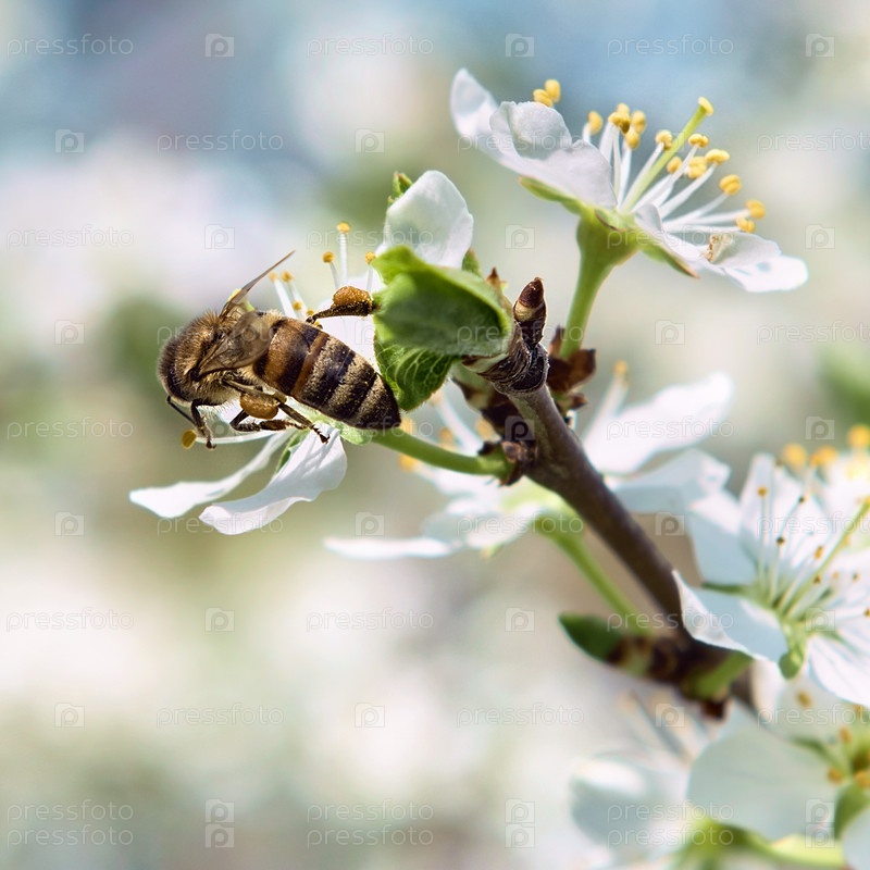 Пчела опыляет цветок вишни крупным планом