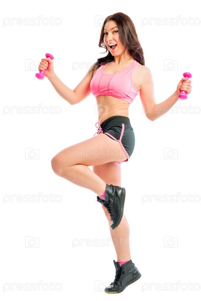 Веселая молодая женщина с гантелями
