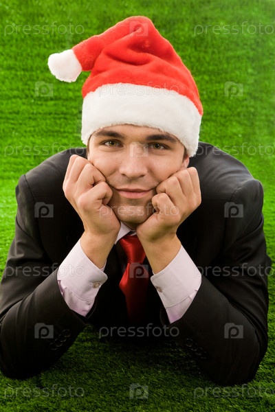Бизнесмен в Санта-Кэпе прикасается к лицу руками, отдыхая на зеленой траве