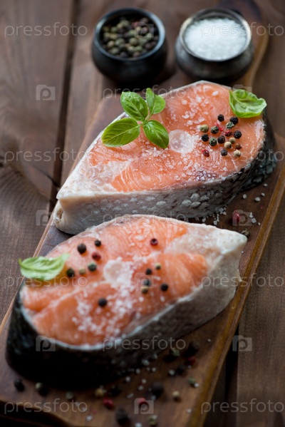 Сырые стейки семги со специями и базиликом