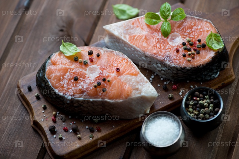 Сырые стейки семги со специями и базиликом