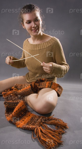 Портрет молодой девушки, занимающейся вязанием шарфа на сером фоне