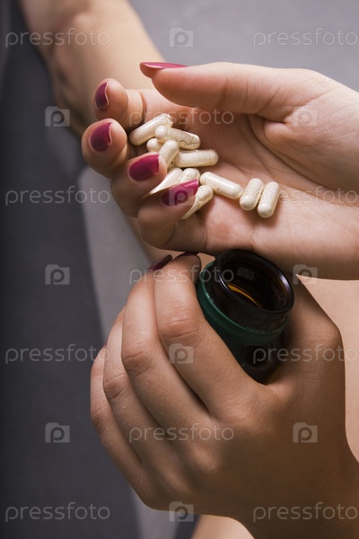 Женские руки с таблетками на сером фоне