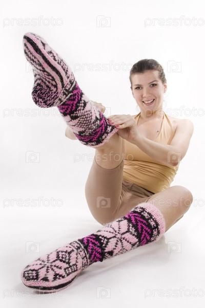 Молодая девушка в цветных шерстяных гетрах, сидящая на белом фоне