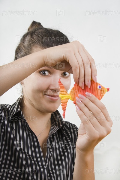 Молодая женщина с глиняной рыбкой в руках