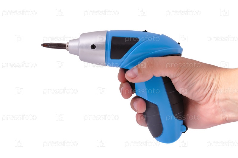 Электрический шуруповерт в руке на белом фоне