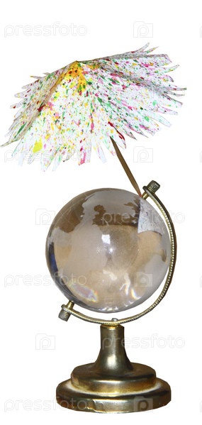 Стеклянный глобус с зонтиком на белом фоне