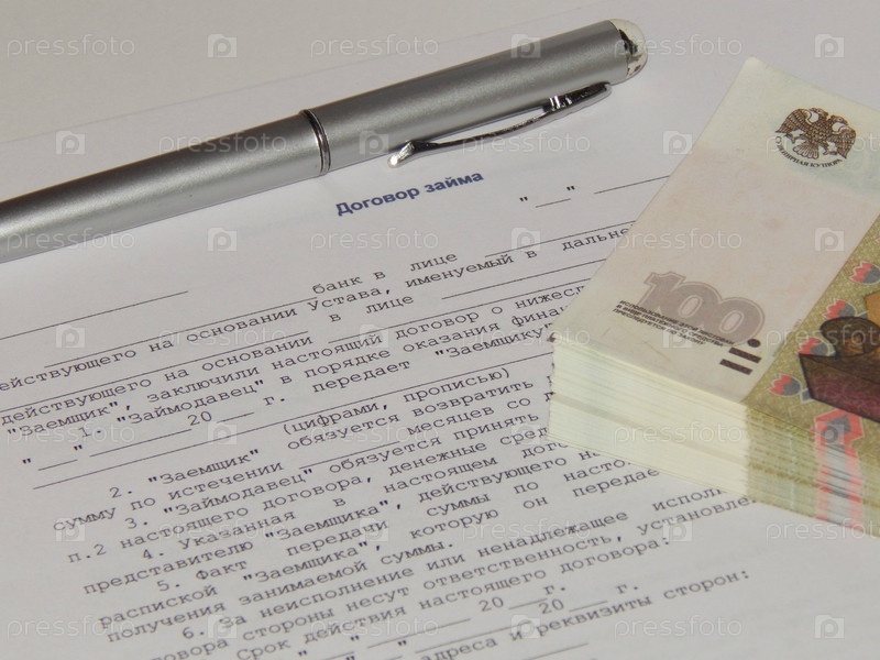 Договор займа, ручка и пачка денег