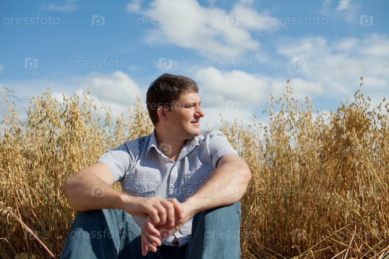Мужчина сидит на поле под голубым небом