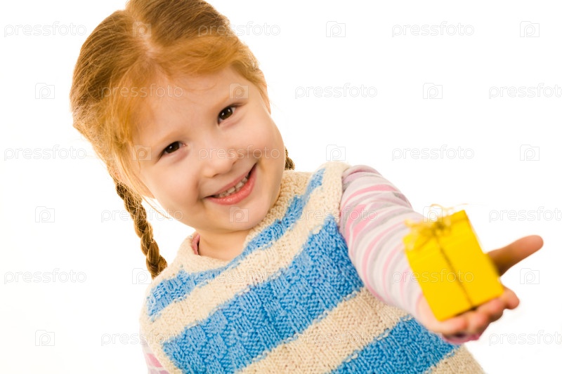 Маленькая рыжеволосая девочка дарит кому-то маленький подарок в желтой коробке и улыбается
