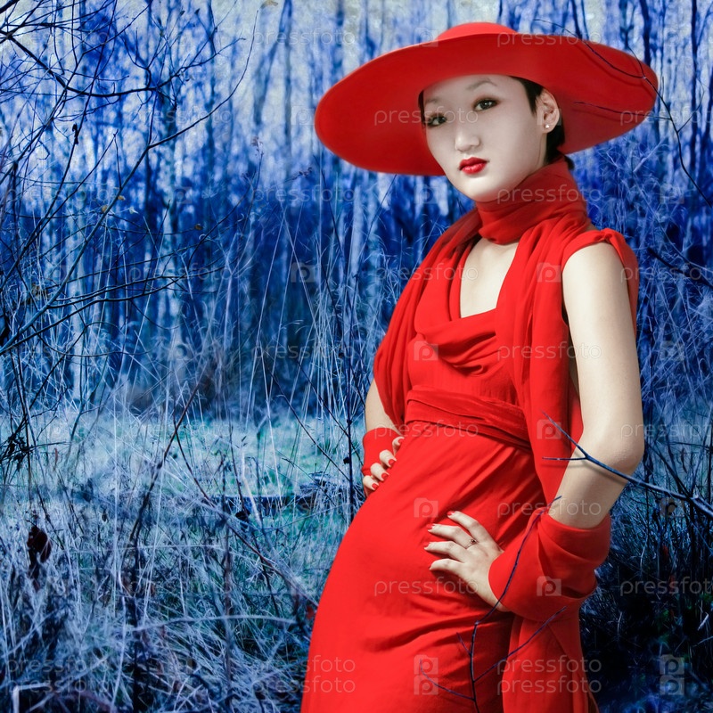 Портрет красивой азиатки в красном платье и шляпе