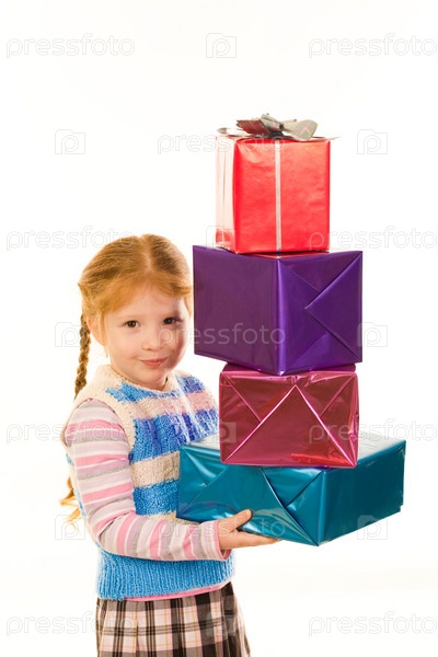 Портрет маленькой девочки с кучей рождественских подарков в руках, глядящей на камеру