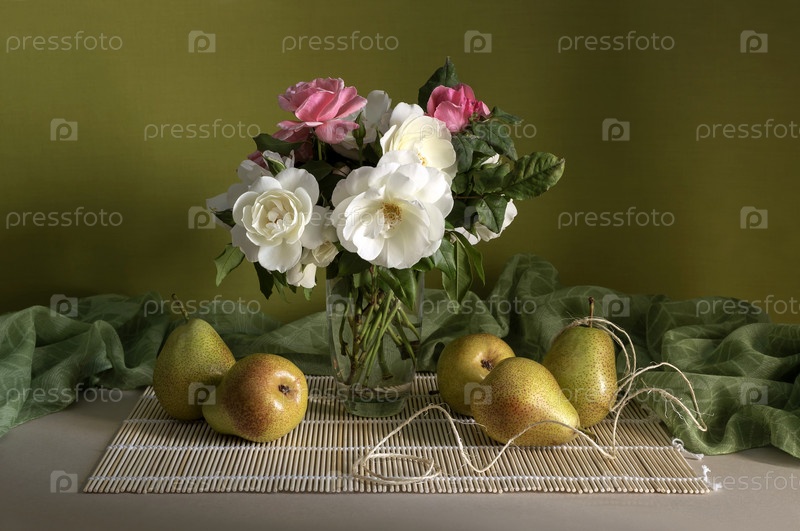Натюрморт с зелеными грушами и розами