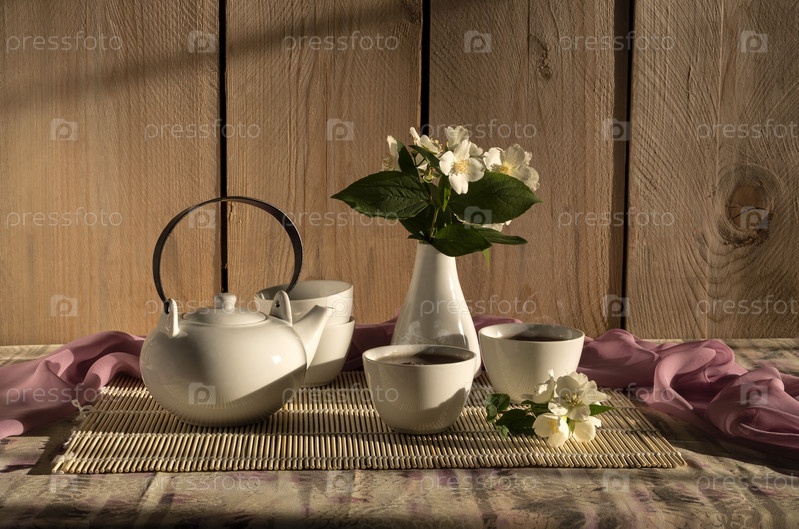 Натюрморт с чайным китайским сервизом и ветками жасмина