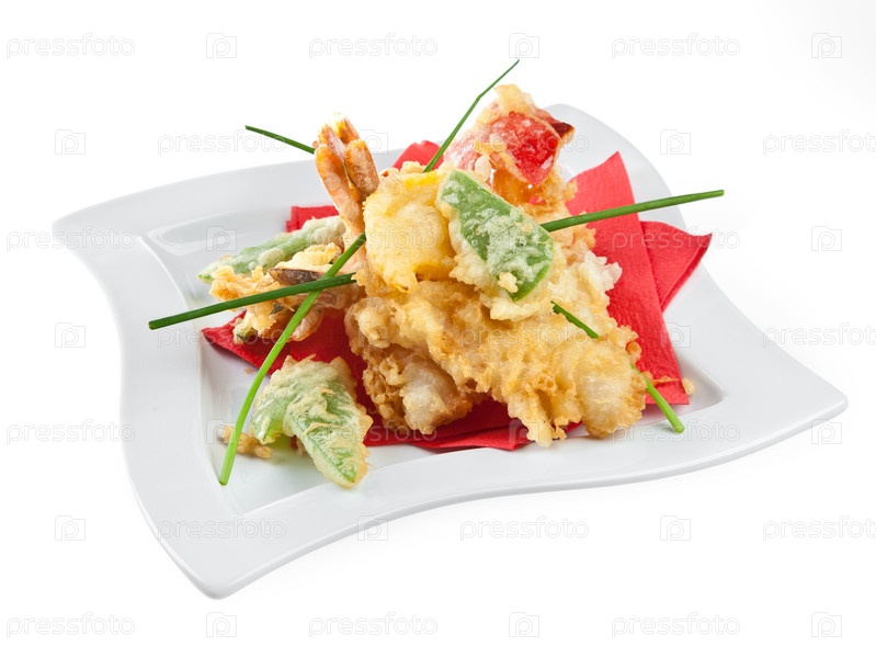 Креветки с овощами в кляре, на белом фоне