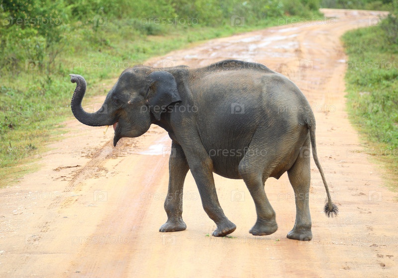 Молодой слон пересекает дорогу