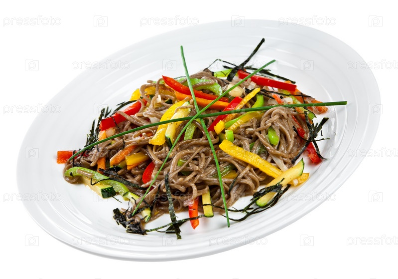 Гречневая лапша соба с овощами, изолирована на белом фоне