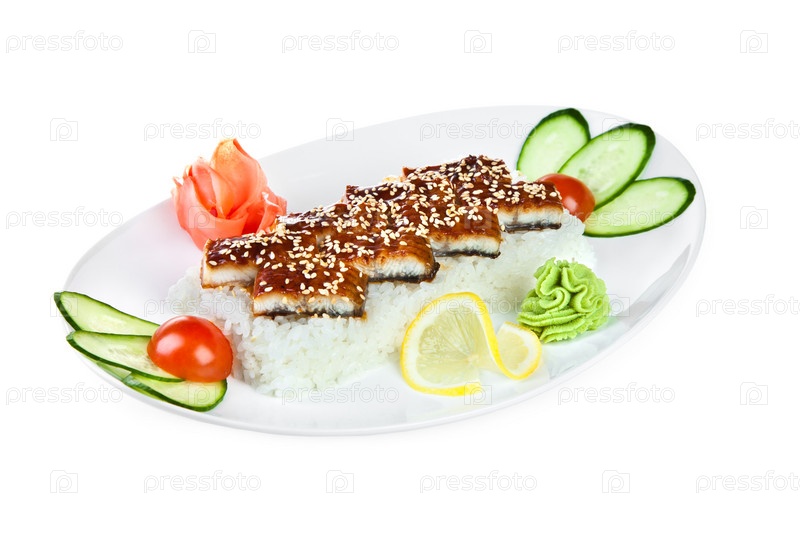 Японская кухня, унаги сашими, белый фон