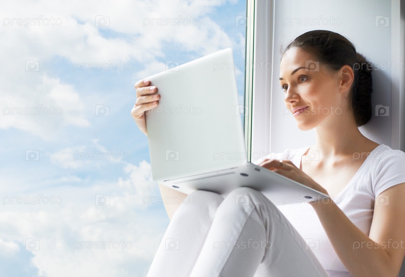 Девушка работает на компьютере в светлой комнате