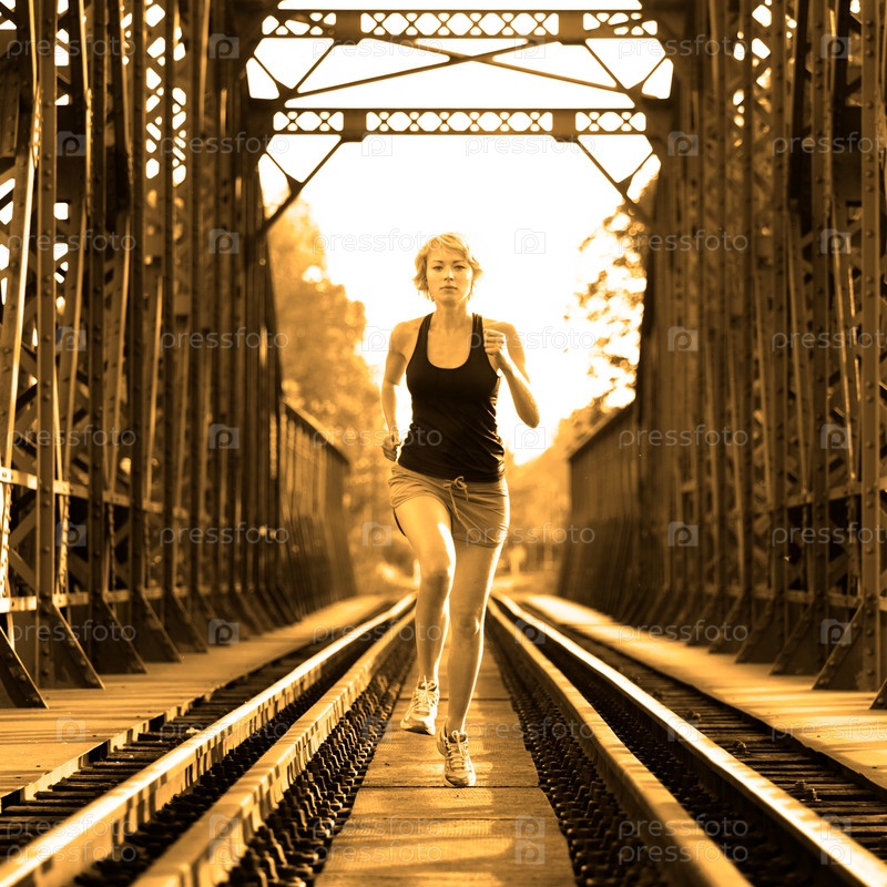 Спортсменка бежит по рельсам
