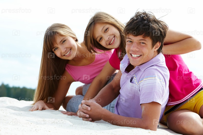 Компания счастливых подростков на пляже
