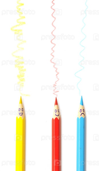Линии от цветных карандашей с нарисованными лицами на белом фоне
