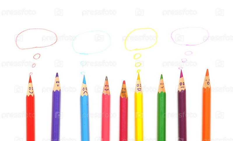 Цветные карандаши с облачками для мыслей и нарисованными лицами на белом фоне