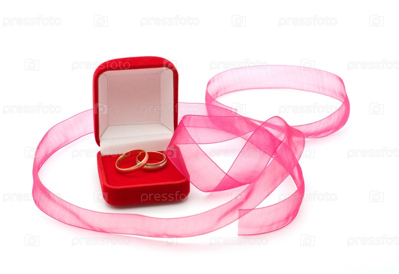 Обручальные кольца в красной коробке и розовая ленточка на белом