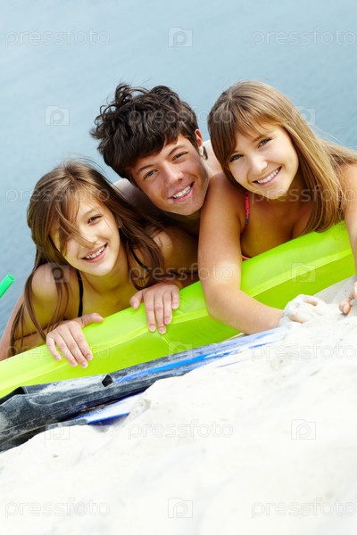 Счастливые подростки на надувном матрасе на пляже