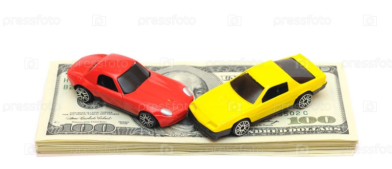 Столкнувшиеся игрушечные машинки на пачке долларов, на белом фоне