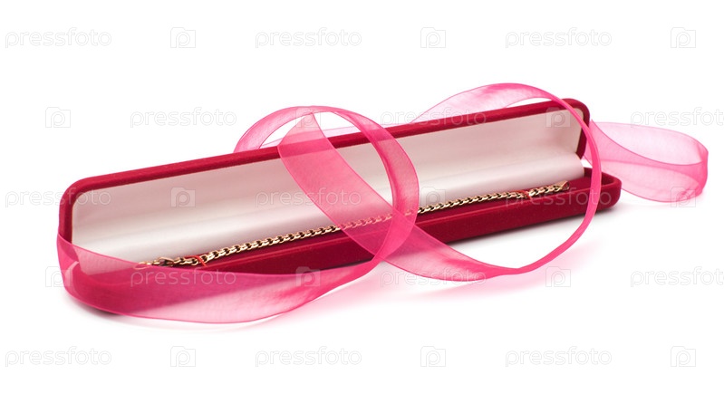 Красная бархатная коробка с золотым браслетом и розовой лентой