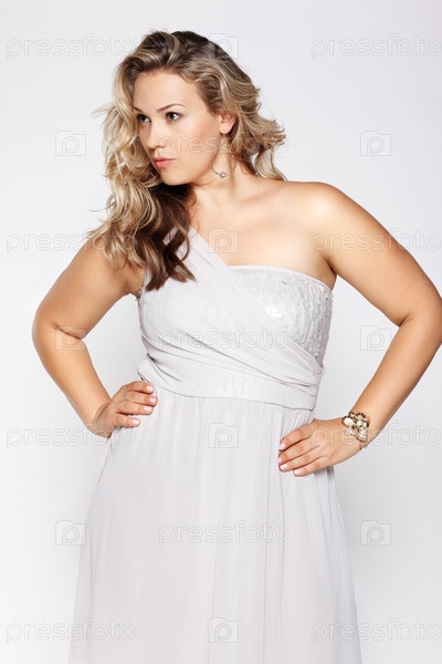 Портрет светловолосой женщины в платье на сером фоне