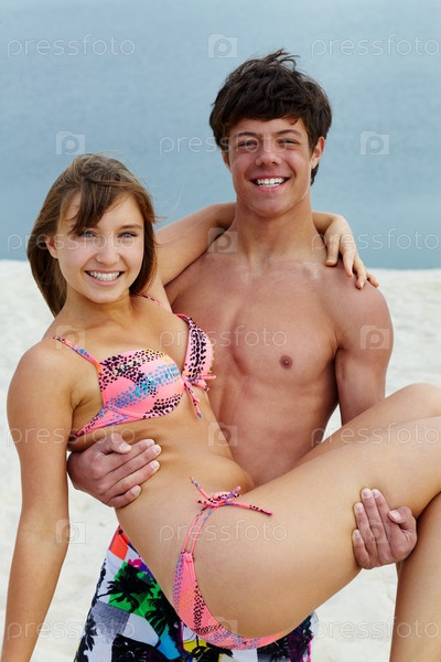 Юноша держит девушку на руках на пляже