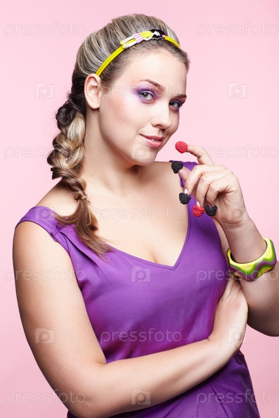 Портрет полной женщины с малиной и ежевикой на пальцах