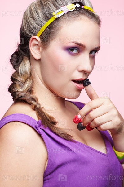 Портрет полной женщины с малиной и ежевикой на пальцах