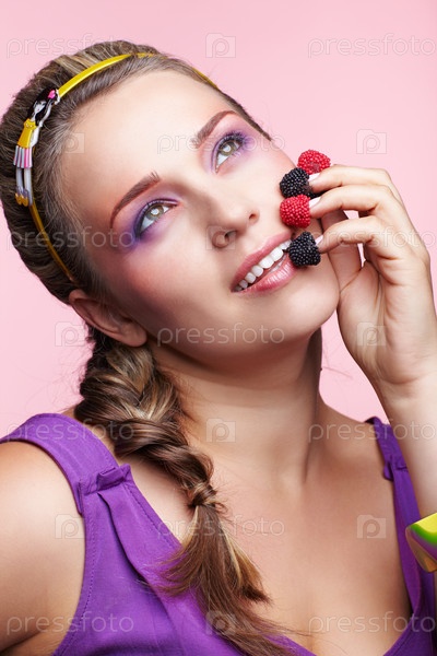 Портрет полной женщины с малиной и ежевикой на пальцах