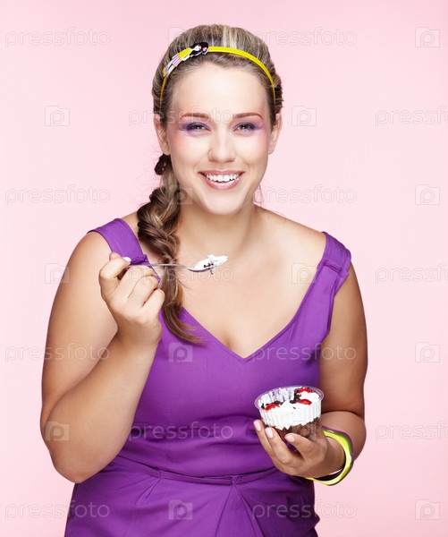 Полная женщина ест пирожное