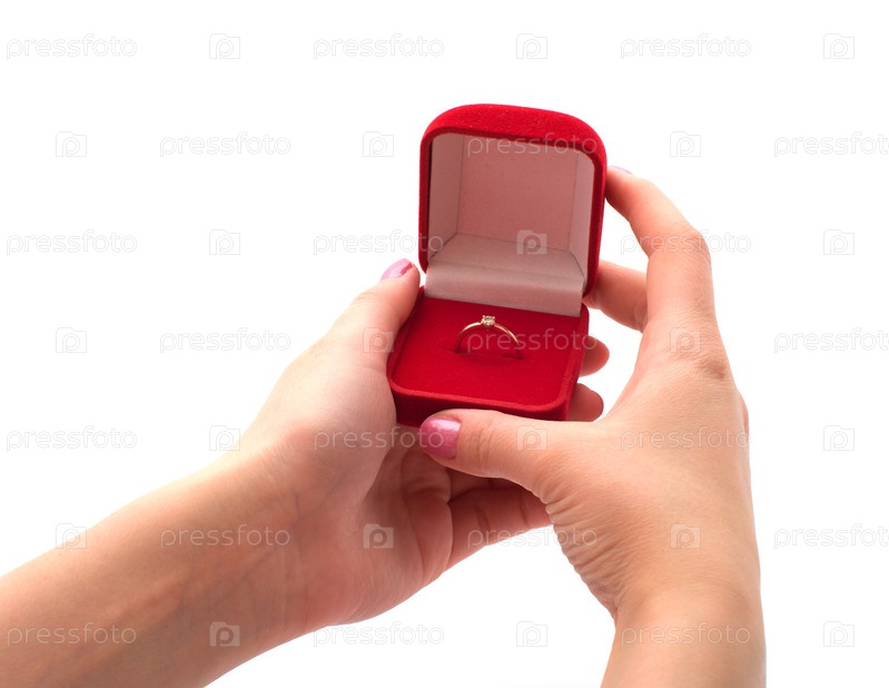 Женские руки держат красную коробку с золотым кольцом, изолиро