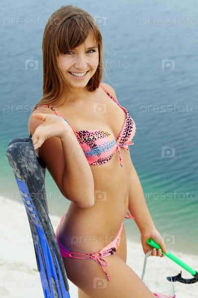 Девушка с ластами и маской для дайвинга на пляже