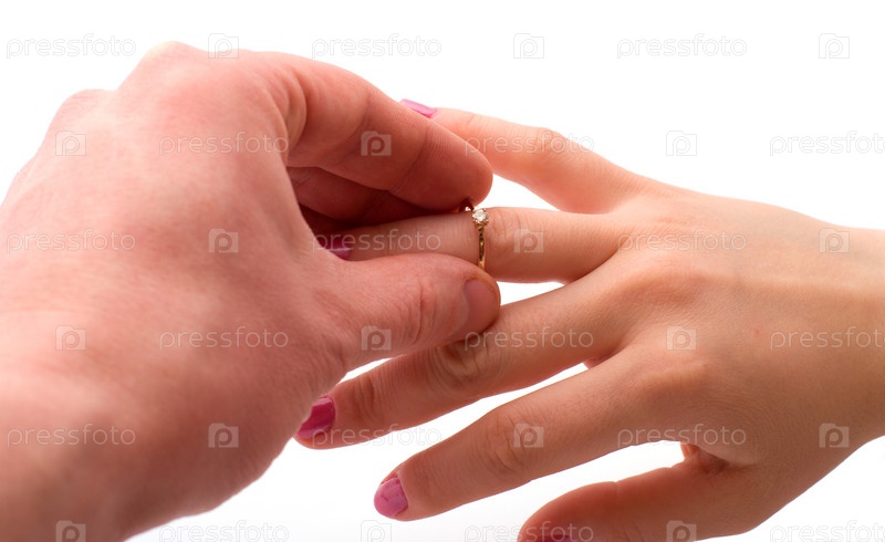 Мужчина надевает золотое кольцо с бриллиантом на женскую руку, из