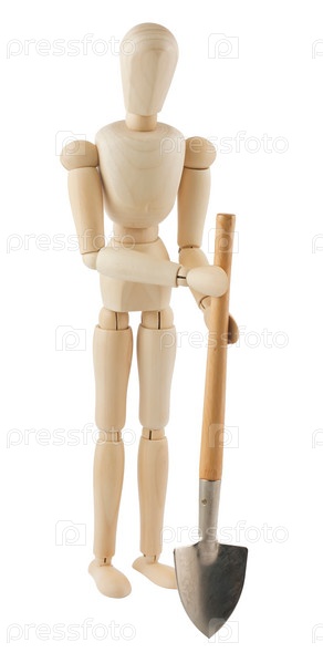 Деревянный человечек с лопатой на белом фоне