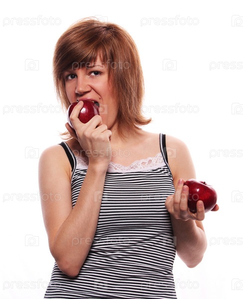 Молодая девушка ест яблоко на белом фоне