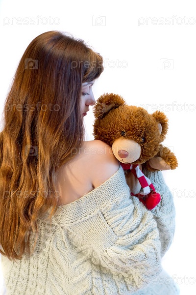 Портрет молодой девушки с плюшевым мишкой на белом фоне