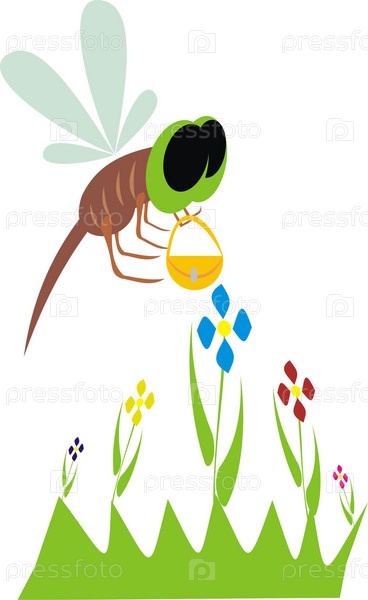 Пчела собирает нектар с цветов, иллюстрация