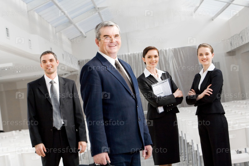 Портрет старшего бизнесмена, смотрящего на камеру на фоне молодых партнеров