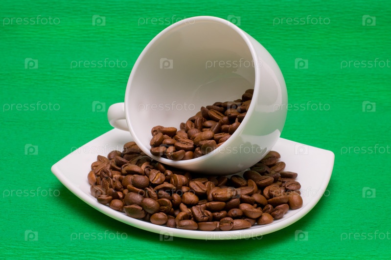 Кружка и блюдце с кофейными зернами на зеленом фоне