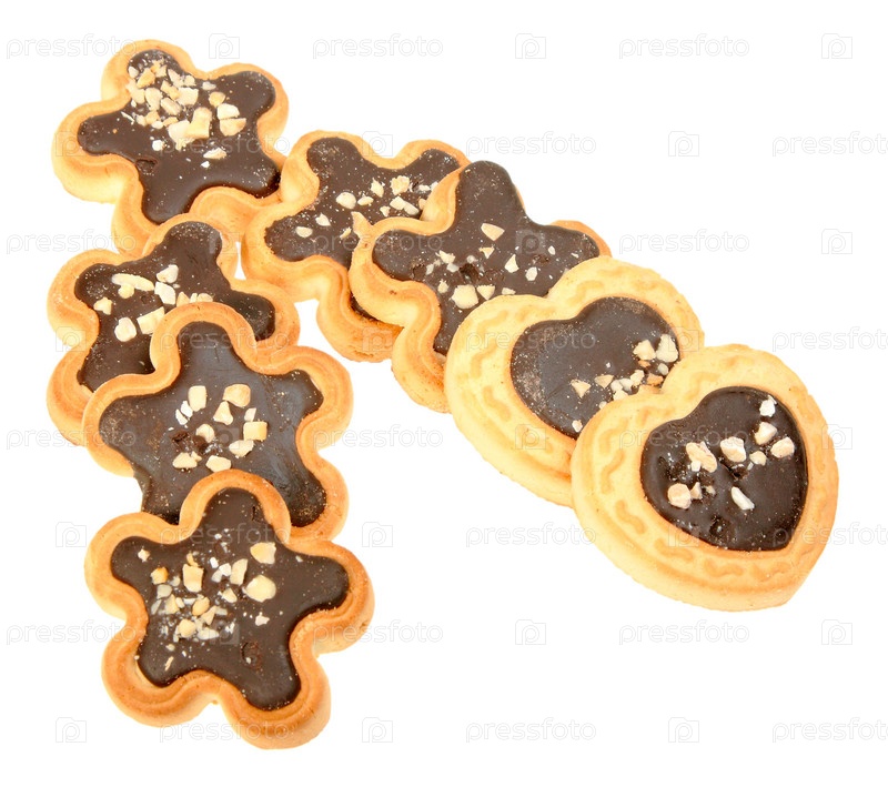 Печенье с шоколадом и орехами в виде цветов и сердец на белом фоне