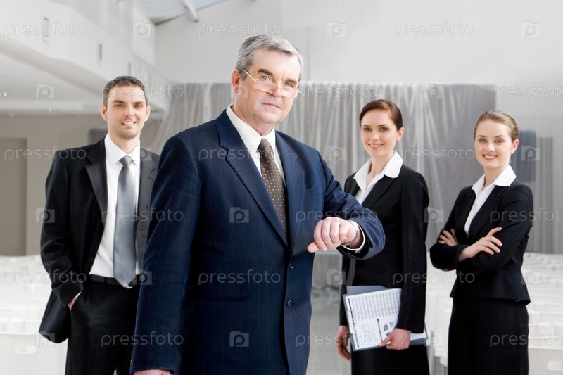 Портрет высокопоставленного бизнесмена, смотрящего на камеру в то же время наблюдая за временем на фоне уверенных менеджеров