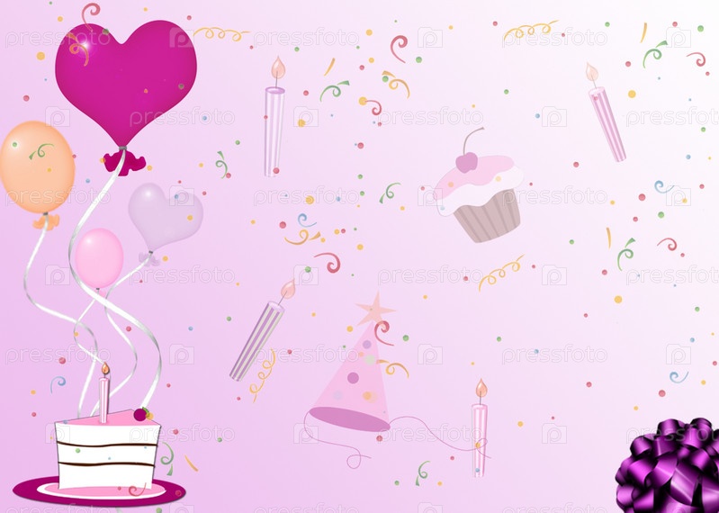 Розовый праздничный фон с шариками, свечками и тортами, иллюстрация