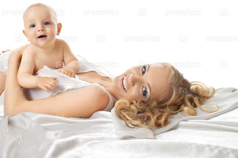 Молодая мама с маленьким сыном на кровати